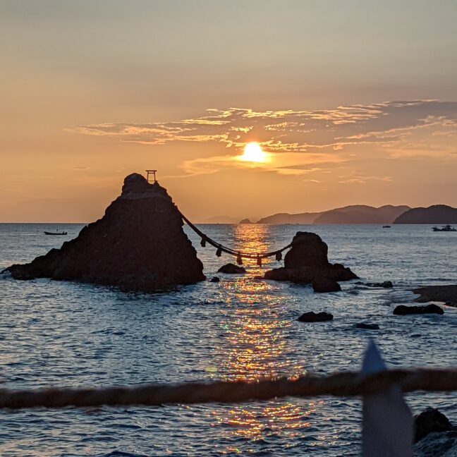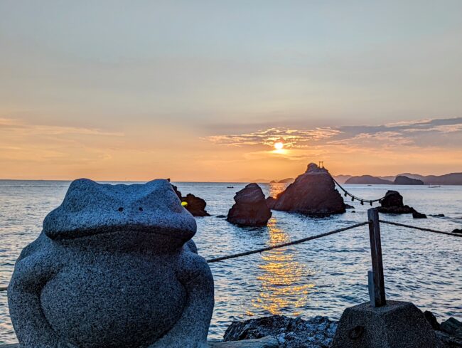 今朝の夫婦岩と日の出。カエルと朝日。